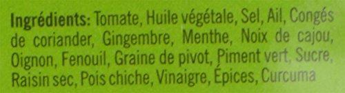 • Ingredients: 68% Tomato, Vegetable oil, Salt, Garlic, Coriander leaves, Ginger, Mint, Onion, Cashew nut, Fennel, Poppy seed, Green chili, Sugar, Raisins, Bengal gram dhal, Vinegar, Spices, Turmeric powder.