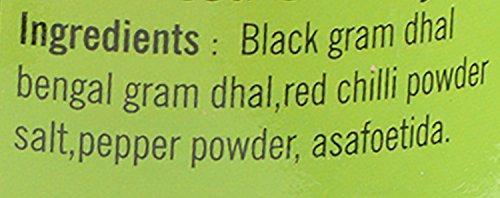- Ingredients: Black gram dhal, Bengal gram dhal, red chili powder, salt, pepper powder, asafetida