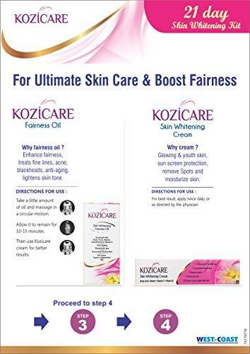- Kozicare 21 day skin whitening kit contains 1 unit of kozicare soap, kozicare cream, kozicare foaming facewash and kozicare fairness oil