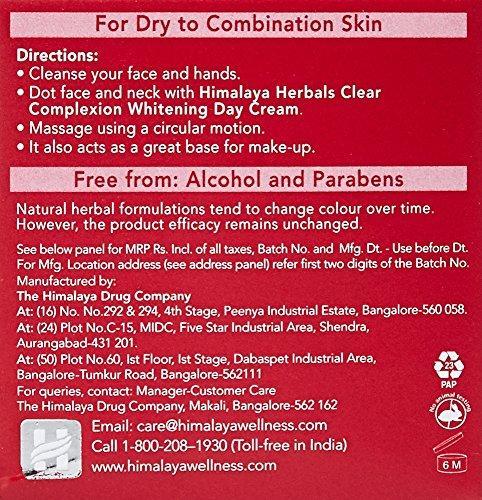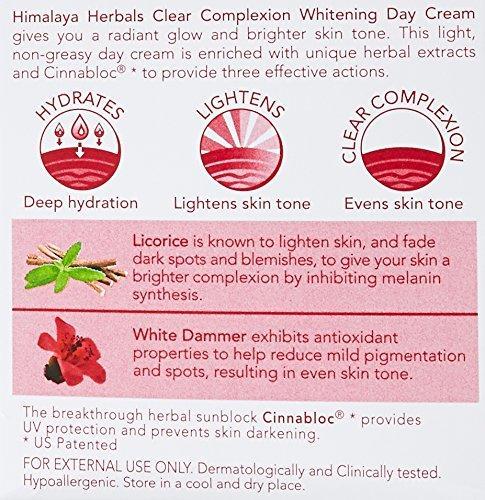 Details: Himalaya’s clear complexion day cream gives a radiant glow and brighter skin tone. Our day cream is light and non greasy, enriched with unique herbal extracts and cinnablo to provide three effective actions, hydrates skin, lightens skin tone, clears complexion.