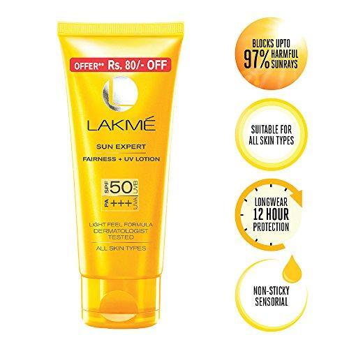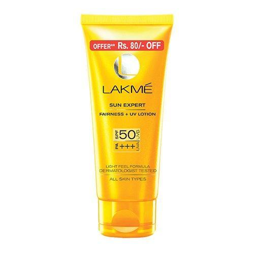 Just minutes under the sun can cause skin tanning. Increased time under the sun can cause sunburn, pigmentation and even photo-ageing! Our straight up advice you ask? Wear sunscreen every day before you step out even if it’s just for a grocery errand or a day at the beach. The Lakmé Sun Expert range provides guaranteed protection from upto 97% harmful sunrays.Lakmé Sun Expert UV + Fairness Lotion is the all-round care and protection that your skin needs this summer. With the new non-sticky and light formulation created specially for the hot and humid Indian whether, you don’t have any excuses to skip it! Also, this range comes with a 12-hour protection tag which means you can be rest assured all day long after application. This lotion is hypoallergenic, dermatologically tested and is perfect for all types of skin. You can apply this after cleansing and hydrating and before putting on makeup. When going out to meet your friends, just apply this and you'll be ready with a glow that is also protecting you. For those who love to step out and have some fun in the sun, you don’t have to think twice about tan-lines. This travel pack is specially designed to be carried everywhere you go.