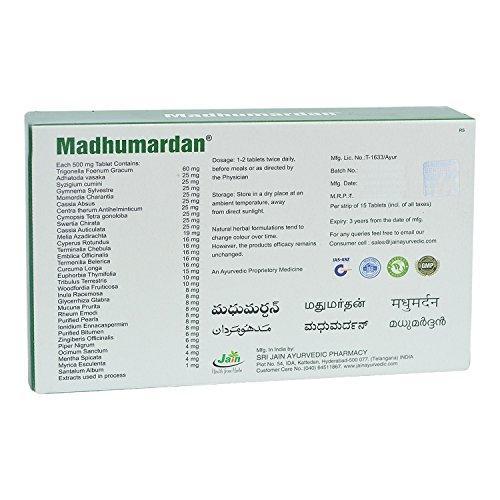 Details: Ingredients : Syzigium Cumini, Swertia Chiraita, Momordia Charantia, Ocimum Sanctum, Santallum Album, Terminalia Chebula, Emblica Officinalis, Purified Pearls, Mineral Pitch, Myrica Esculanta, Melia Azadirachta, Centra Therum Antheliminticum, Curcuma Longa, Terminalia Belerica, Adhatoda Vasica, Glycerrhiza Glabra, Inula Racemosa, Zingiber Officinale, Piper Nigrum, Cyperus Rotundus, Mentha Spicata, Rheum Emodi, Woodfordia Fruticosa, Cassia Auriculata, Gymnema Sylvestre, Mucuna Prurita, Tribulus Terrestris, Trigonella Foenum Graecum, Cassia Absus, Ionidium Enncaspermin, Cymopsis Tetragonoloba, Euphorbia Thymi Folia