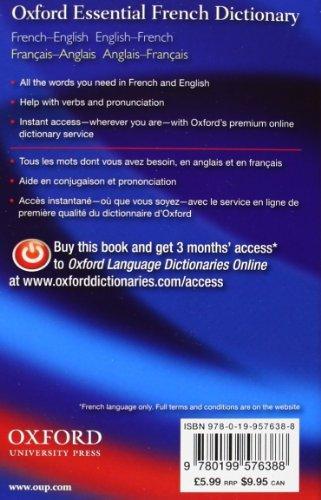 Details: The Oxford Essential French Dictionary is a new compact French-English and English-French dictionary that offers up-to-date coverage of all the essential day-to-day vocabulary with over 40,000 words and phrases and 60,000 translations. This dictionary is easy to use and ideal for travel, work, or study.