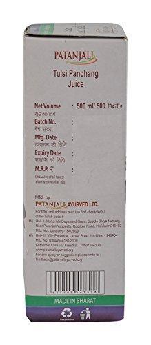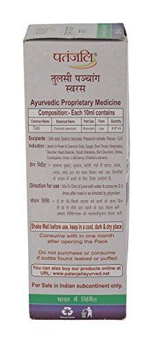 Tulsi Panchang Juice 500 ml. Ayurvedic Proprietary Medicine. Composition: Each 10 ml contains Tulsi (Ocimum sanctum) 9.97 ml. Indication: Useful in Fever & Common Cold, Cough, Sore Throat, Respiratory Disorder, Heart Disorder, Mouth Infections, Skin Disorders, Stress, Constipation, Immuno deficiency, Children's ailments. Direction of use : Mix 5-10 ml of juice with water & consume 2-3 times after meal or as directed by physician.