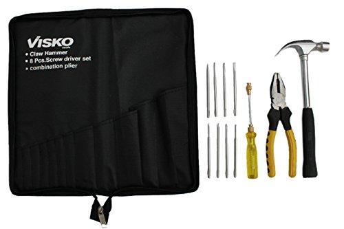 Details: Home Hand Tool Kit from VISKO TOOLS, With a claw hammer, eight screwdriver blades and a pair of combination pliers will let you fix furniture legs, tighten screws of electrical boxes or hang picture frames on walls. The items in this kit come neatly wrapped in a folder with slots for holding them safely. This folder lets you store them together safely or take them around without dropping any of them.